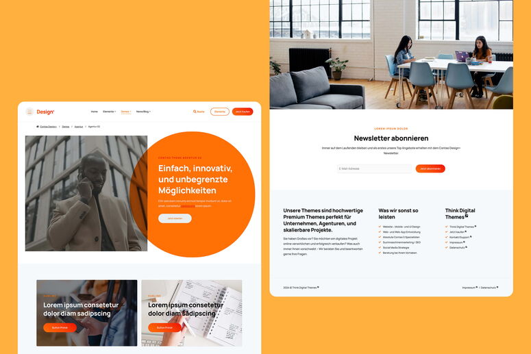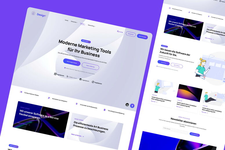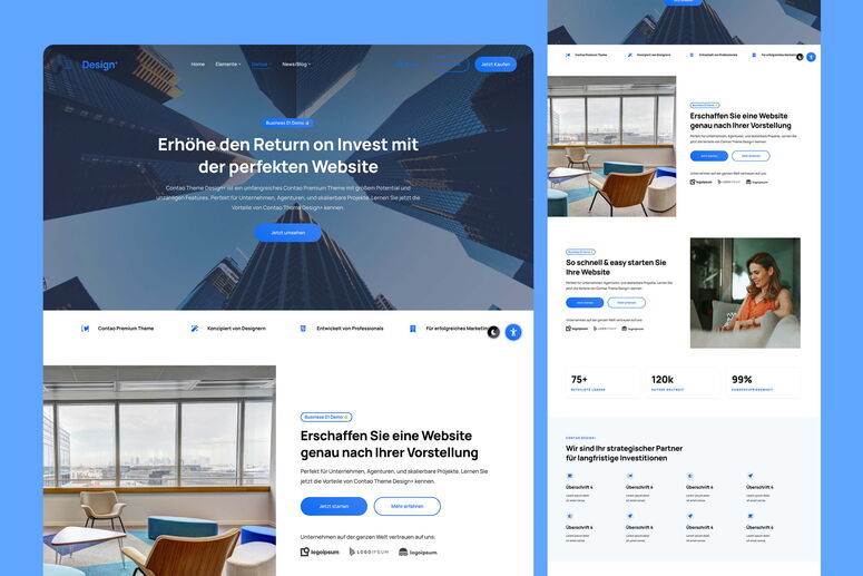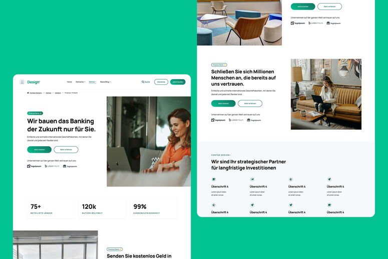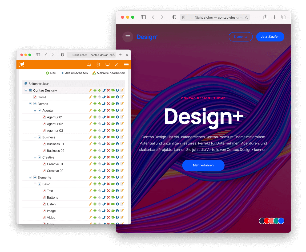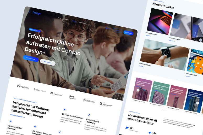 Mit Contao 4 oder Contao 5 als intuitiver Basis ermöglicht das Theme verschiedenste Anforderungen mit Leichtigkeit und ohne Programmierkenntnisse umzusetzen. Aus einem Set von über 100 aufeinander abgestimmten Elementen können innovative Onepager oder umfangreiche Business Websites im Handumdrehen erstellt werden. Hunderte Kunden haben Contao Design+ bereits erfolgreich im Einsatz. Nutzen auch Sie jetzt die Vorteile von Contao Design+.